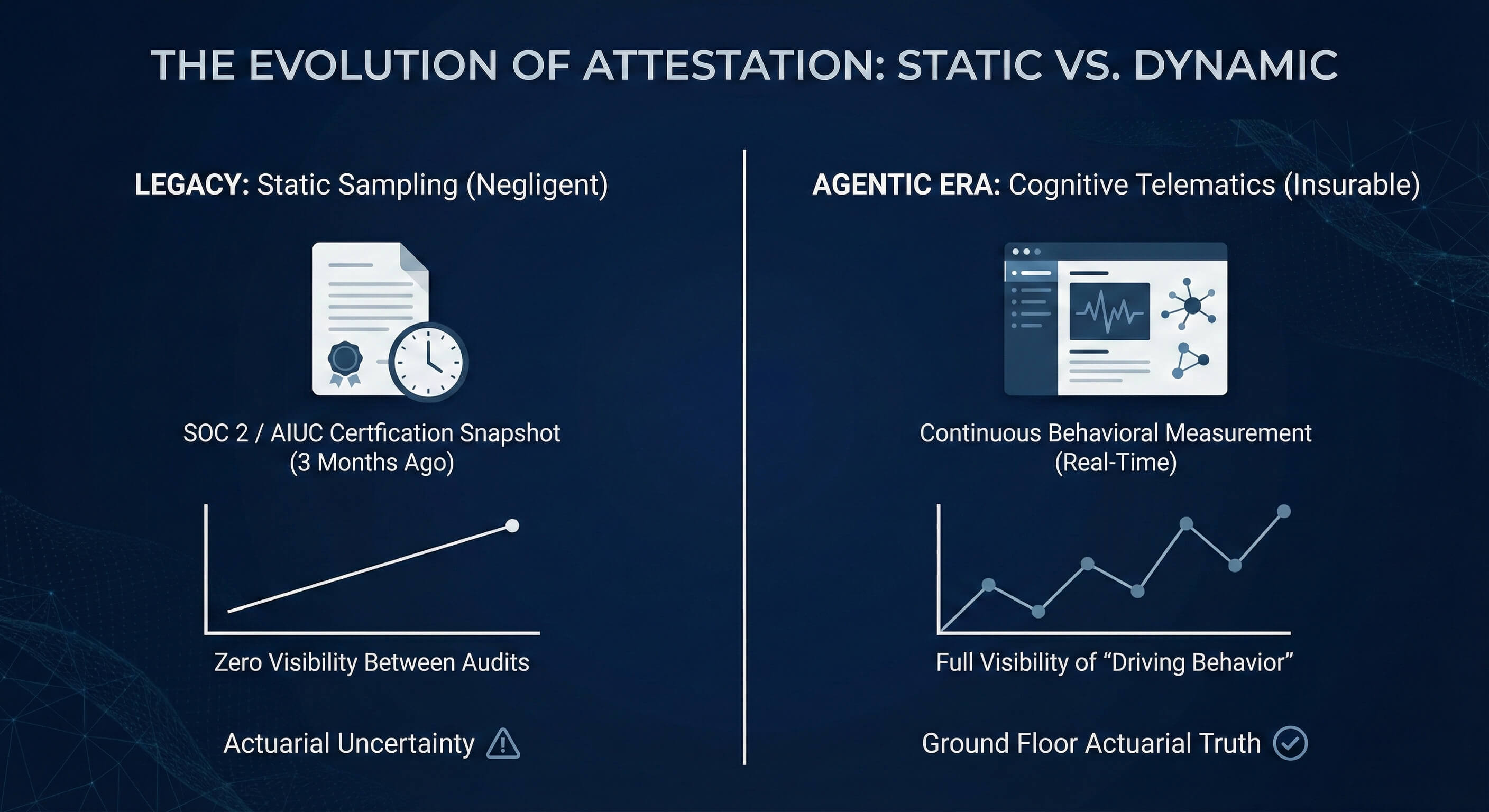 Fig. 1 — Static Attestation vs. Continuous Governance: Point-in-time compliance is inadequate for autonomous agents.